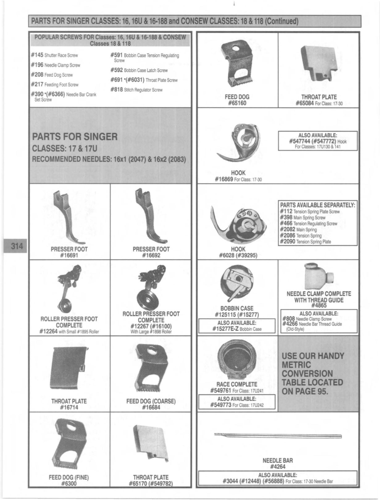 PARTS FOR SINGER CLASSES: 16, 16U