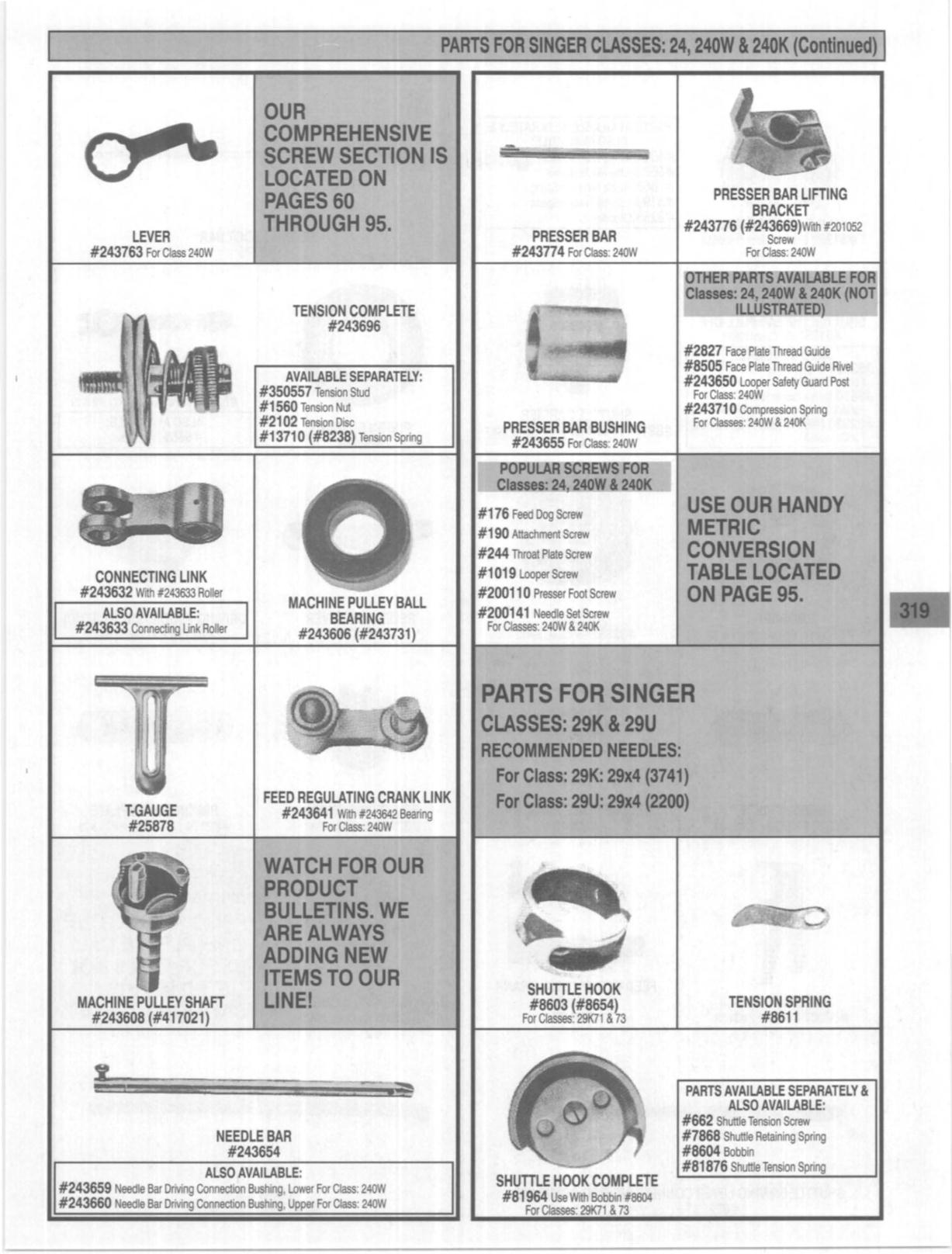PARTS FOR SINGER CLASSES: 24, 240W• 2401(