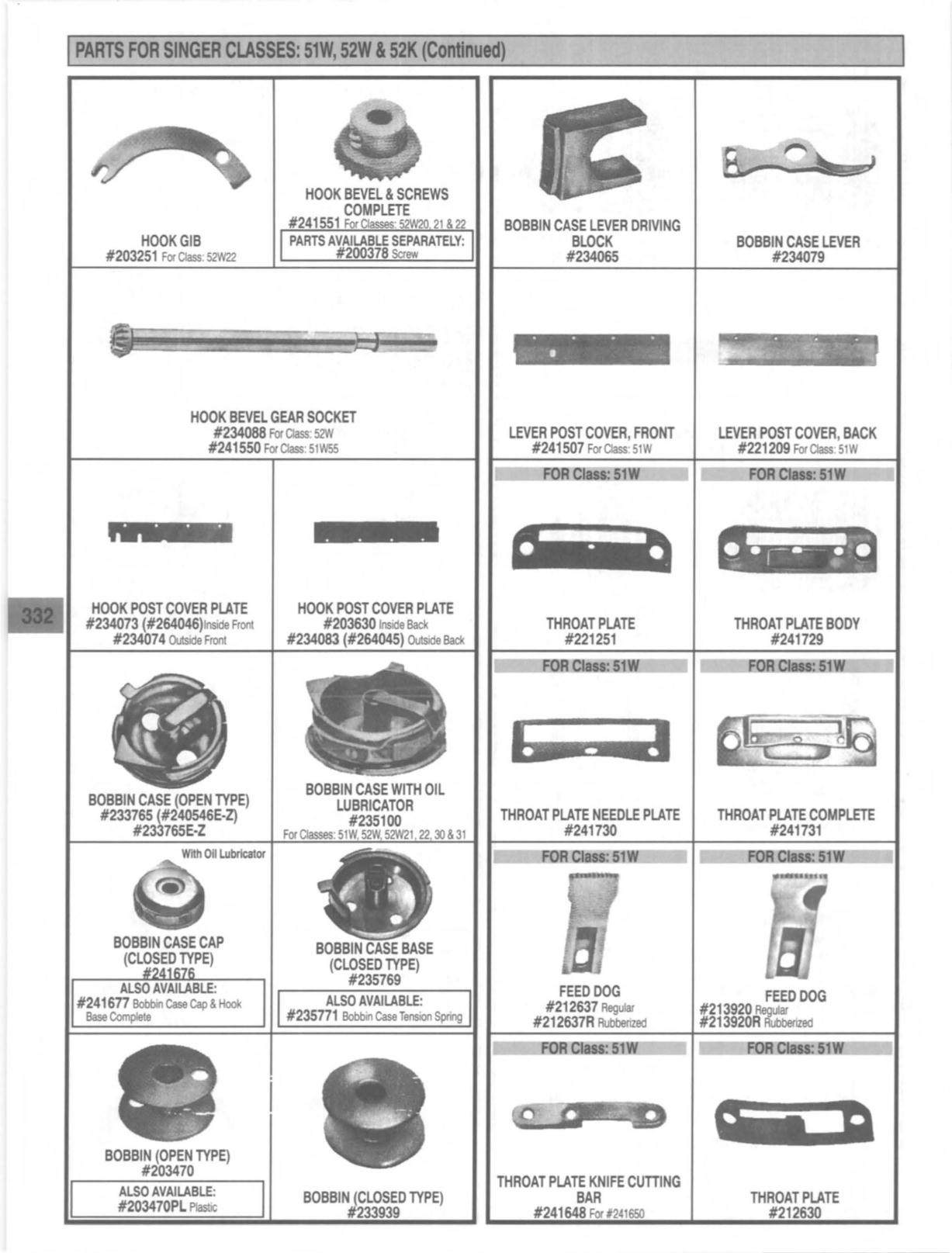 PARTS FOR SINGER CLASSES: 51W, 52W152K