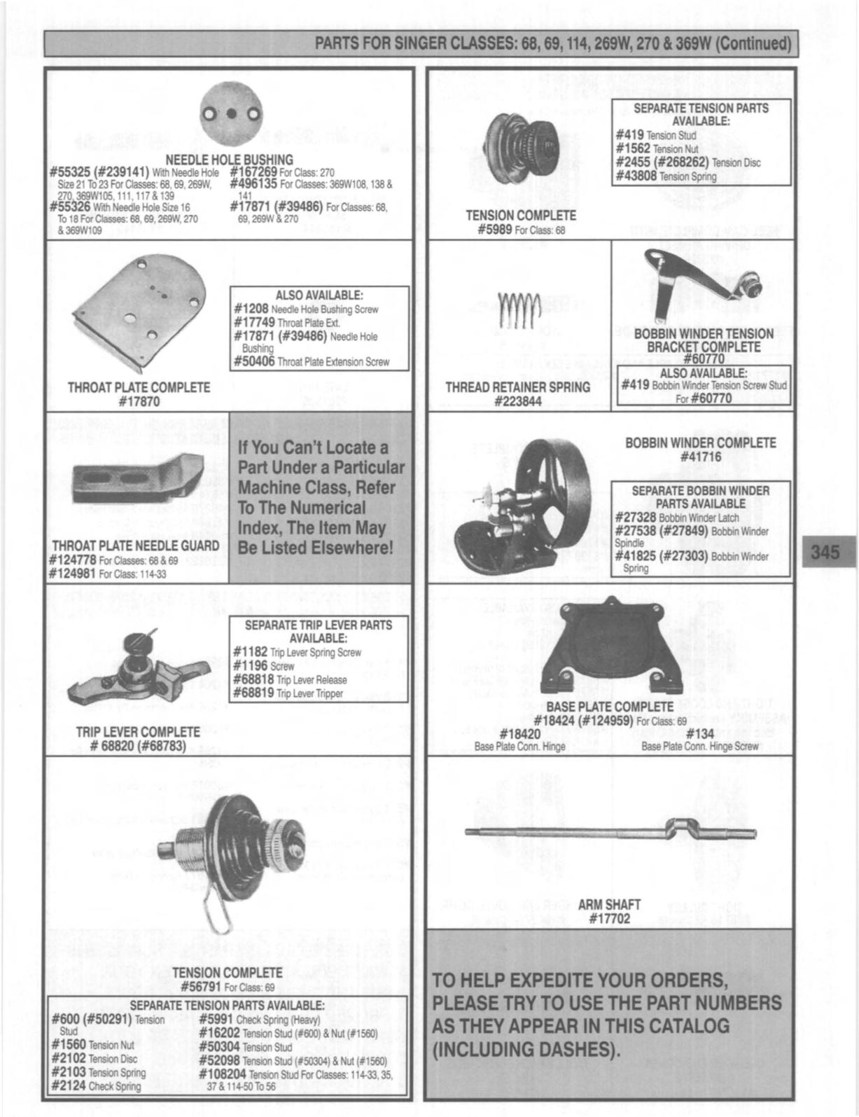 PARTS FOR SINGER CLASSES: 68, 69, 114, 269W, 270 6 369W