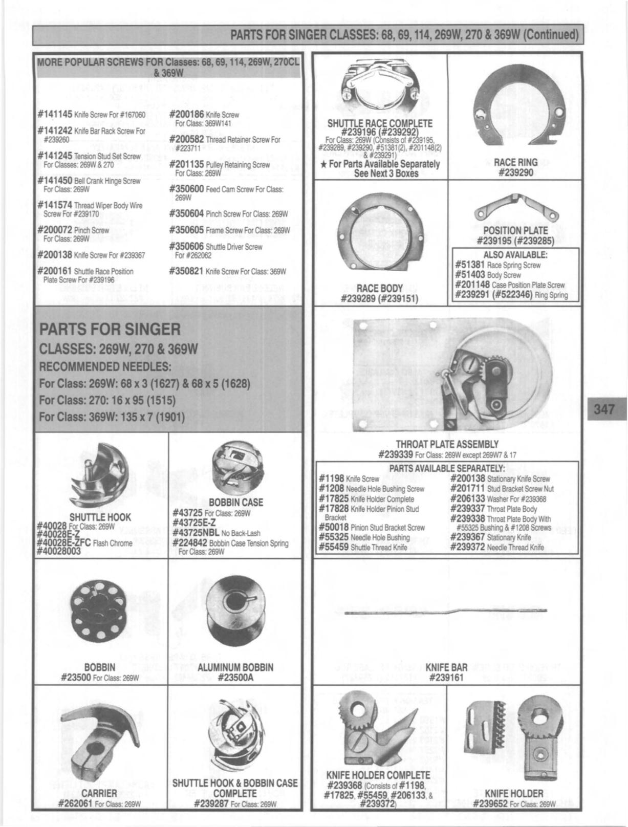 PARTS FOR SINGER CLASSES: 68, 69, 114, 269W, 270