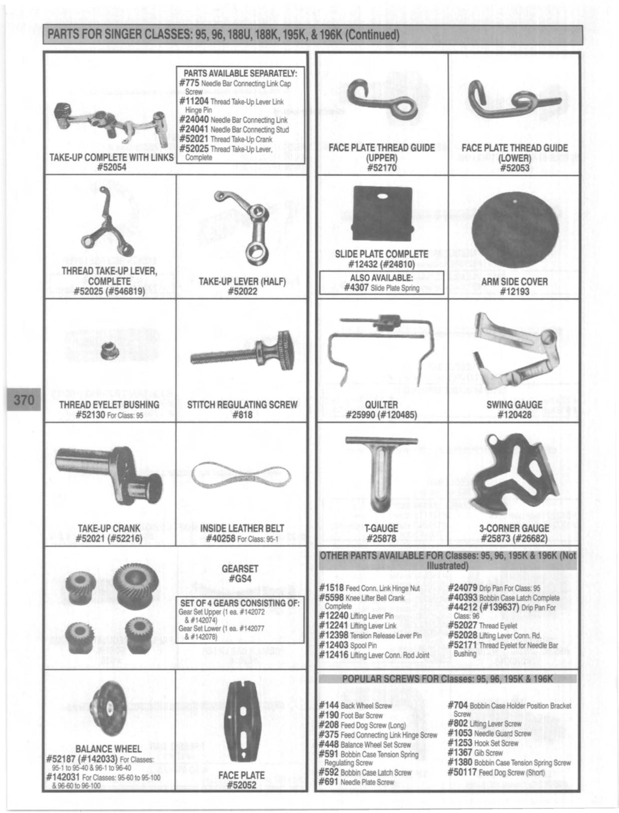 PARTS FOR SINGER CLASSES: 95, 96, 188U, 1881(, 195K,