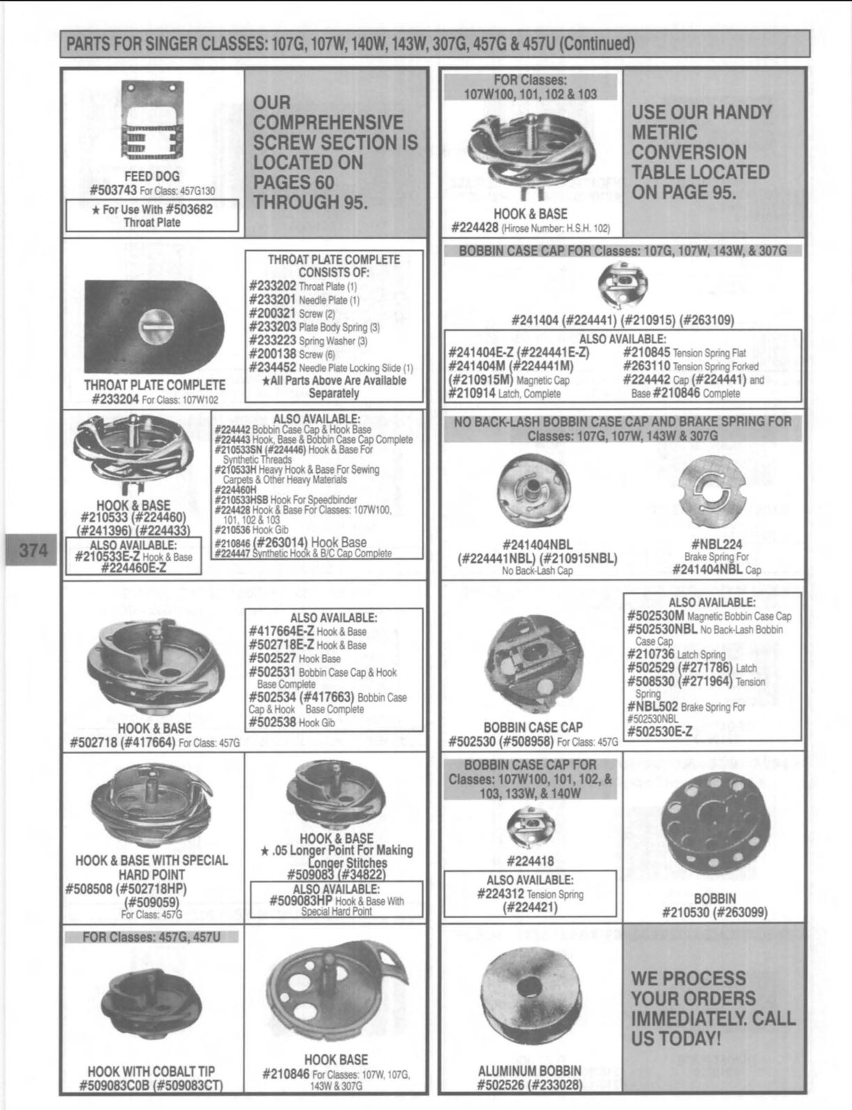 PARTS FOR SINGER CLASSES: 107G, 107W, 14OW, 143W, 307G, 457G • 457U