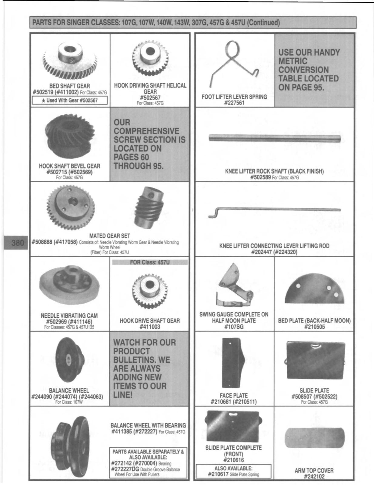 PARTS FOR SINGER CLASSES: 107G, 107W, 140W, 143W, 307G, 457G &457U (Continued)