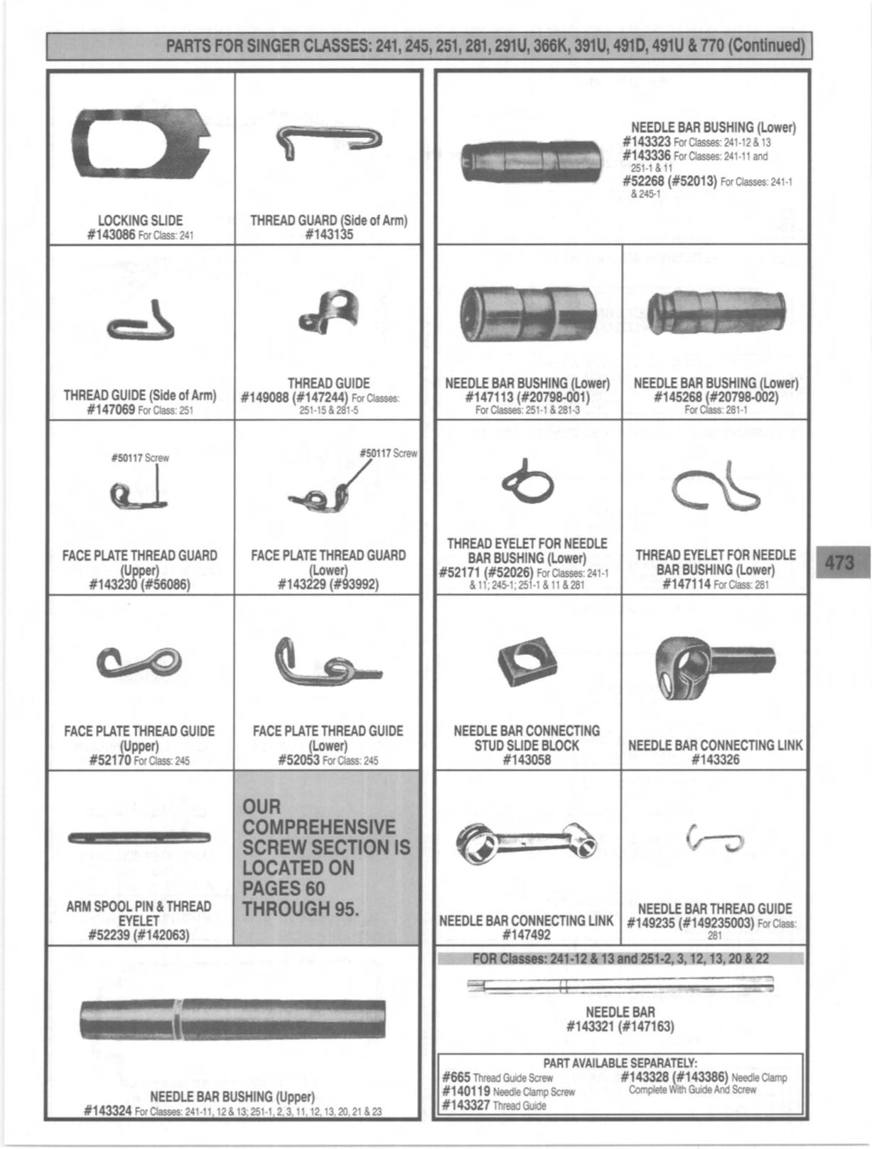 PARTS FOR SINGER CLASSES: 241, 245, 251, 281, 291U, 3661(, 391U, 491D, 491U