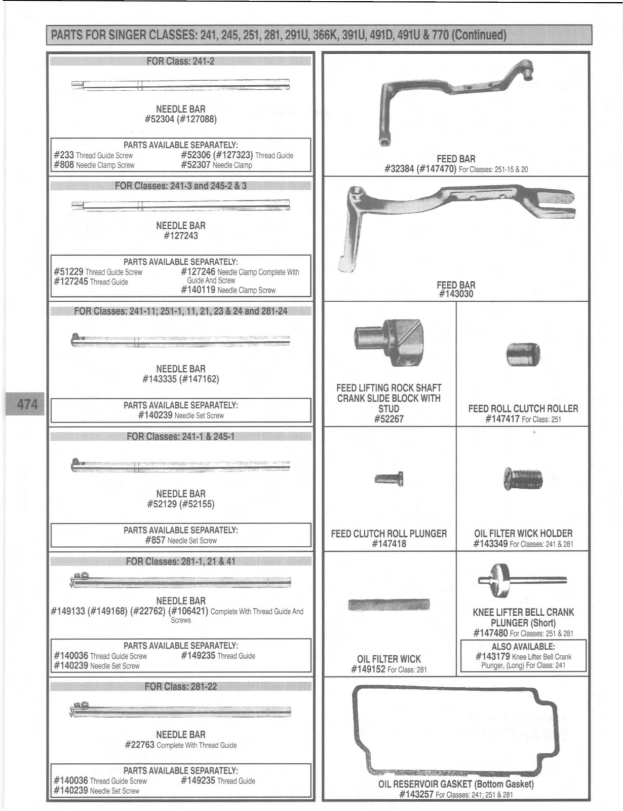 PARTS FOR SINGER CLASSES: 241,245,251,281, 291U, 366K, 391U, 4910, 491U