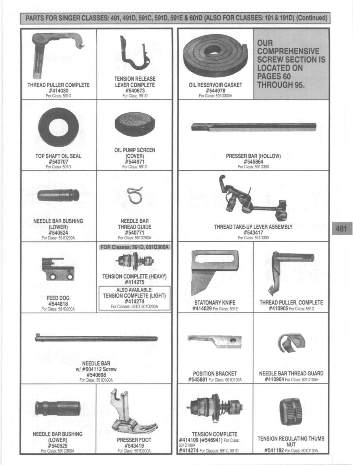 PARTS FOR SINGER CLASSES: 491, 4910, 591C, 5910, 591E 16010 (ALSO FOR CLASSES: 19111910) (ContInued)