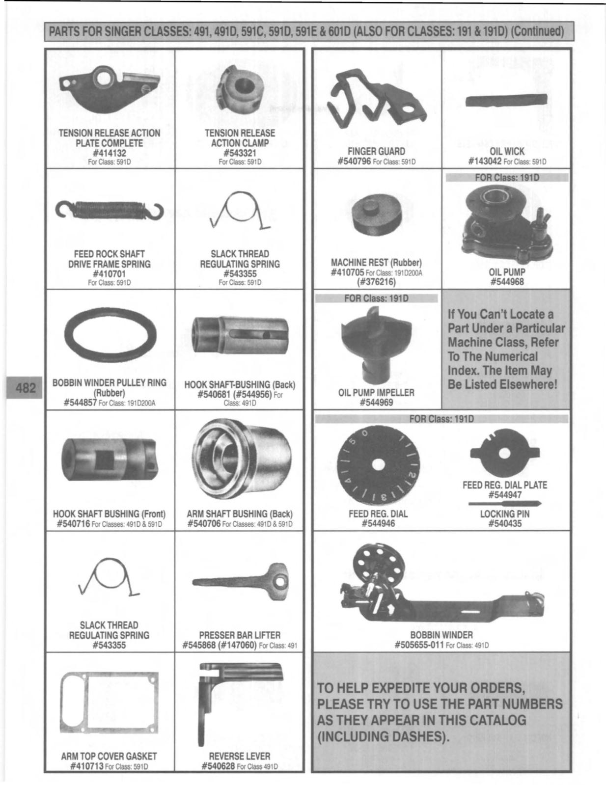 PARTS FOR SINGER CLASSES: 491,4910, 591C, 5910 591E &6010 (ALSO FOR CLASSES: 191 &1910) (Continued)